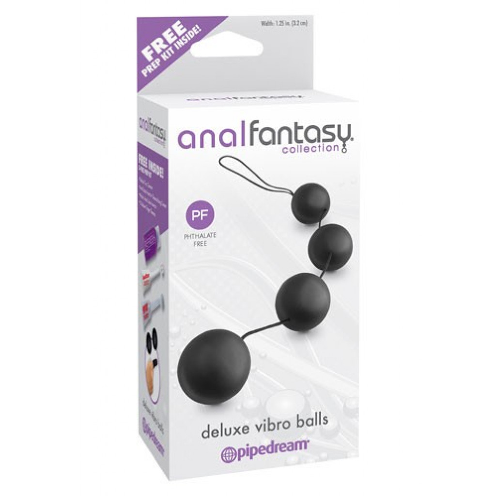 Firmly textured, uniquely designed and absolutely user friendly, this creatively lengthy set of dramatically weighted Deluxe Vibro Balls from Pipedream s Anal Fantasy collection is a fantastically pleasurable take on the classic ben wa ball, geared instead toward anal bliss.