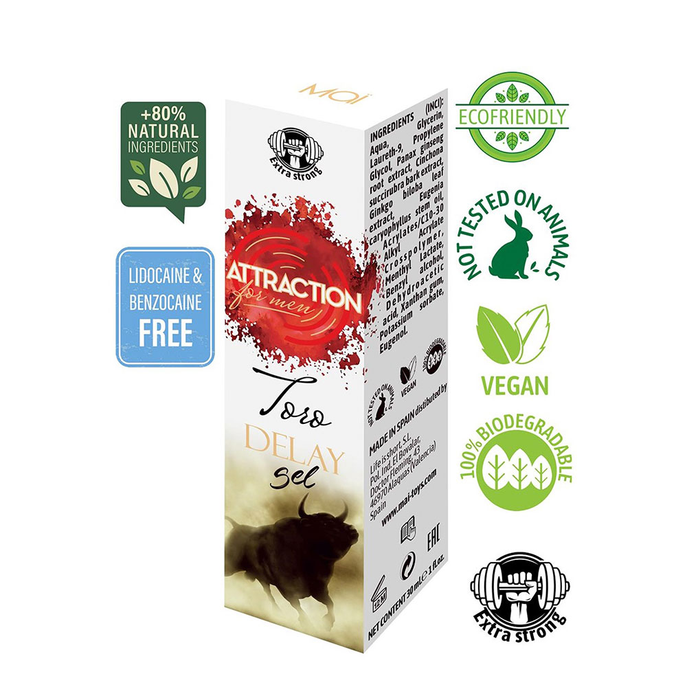 The Toro Delay Gel 30 ml is a product designed to improve male sexual performance and to ensure long lasting and maximum satisfaction in sexual intercourse thanks to safe, natural ingredients in harmony with the planet.