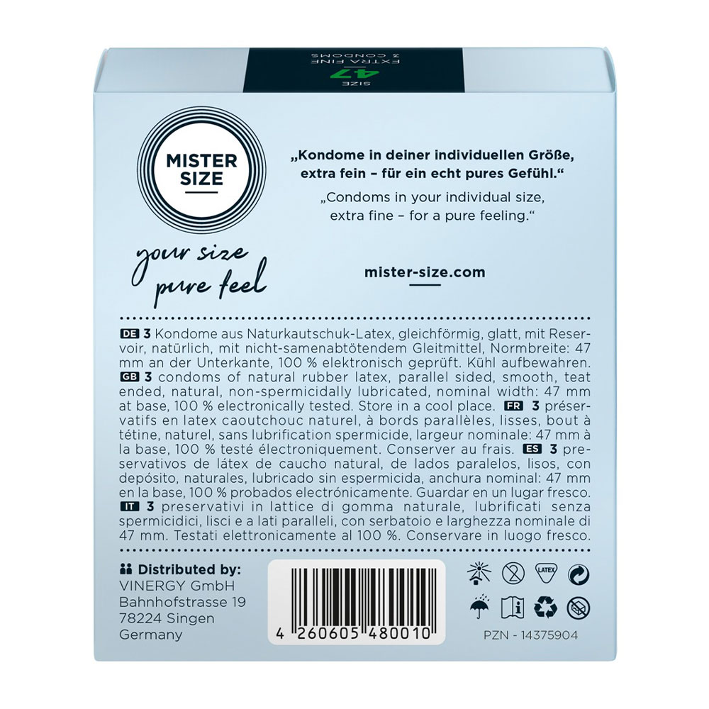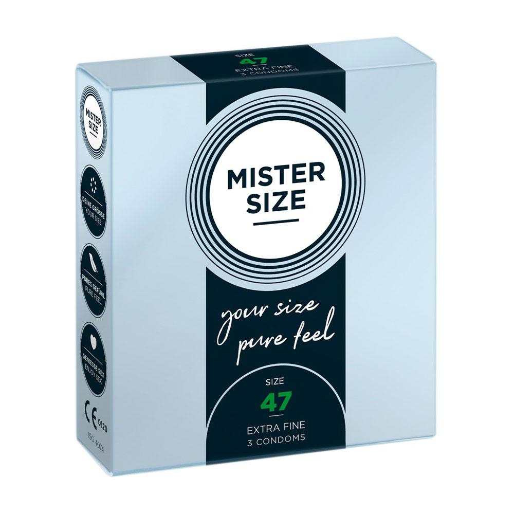 MISTER SIZE fits and feels on your penis like a second skin, for even more realistic sensation! Why? It's almost custom made. This condom is cut to measure. Transparent, extremely thin Mister Size condoms (47 mm) made out of natural rubber latex. The condoms are covered in lubricant and are teat-ended. Vegan. A man / woman can pick the right condom size for the penis by using the front of the packaging because there is a wide, dark blue measuring scale in the middle.