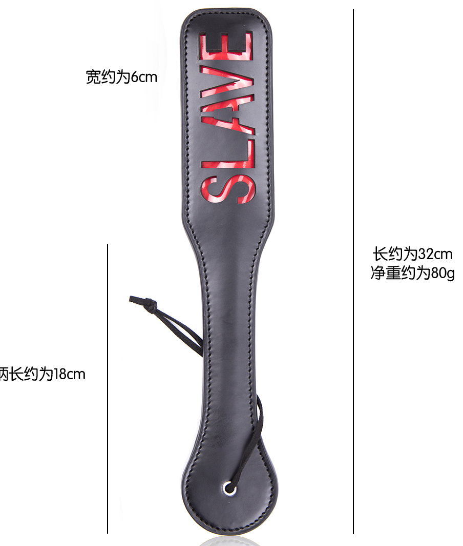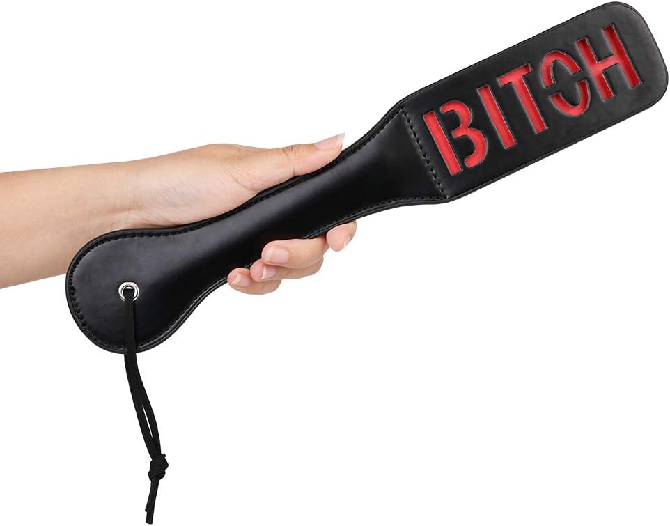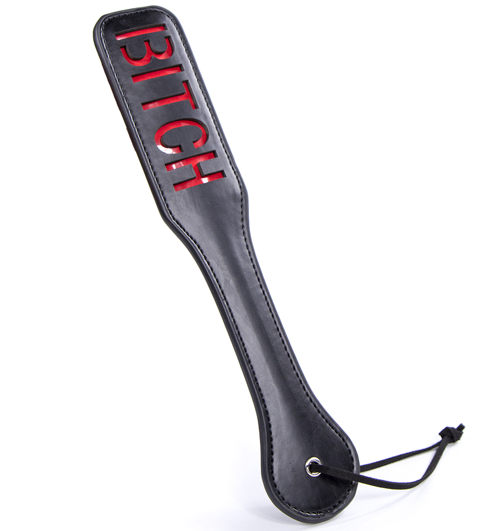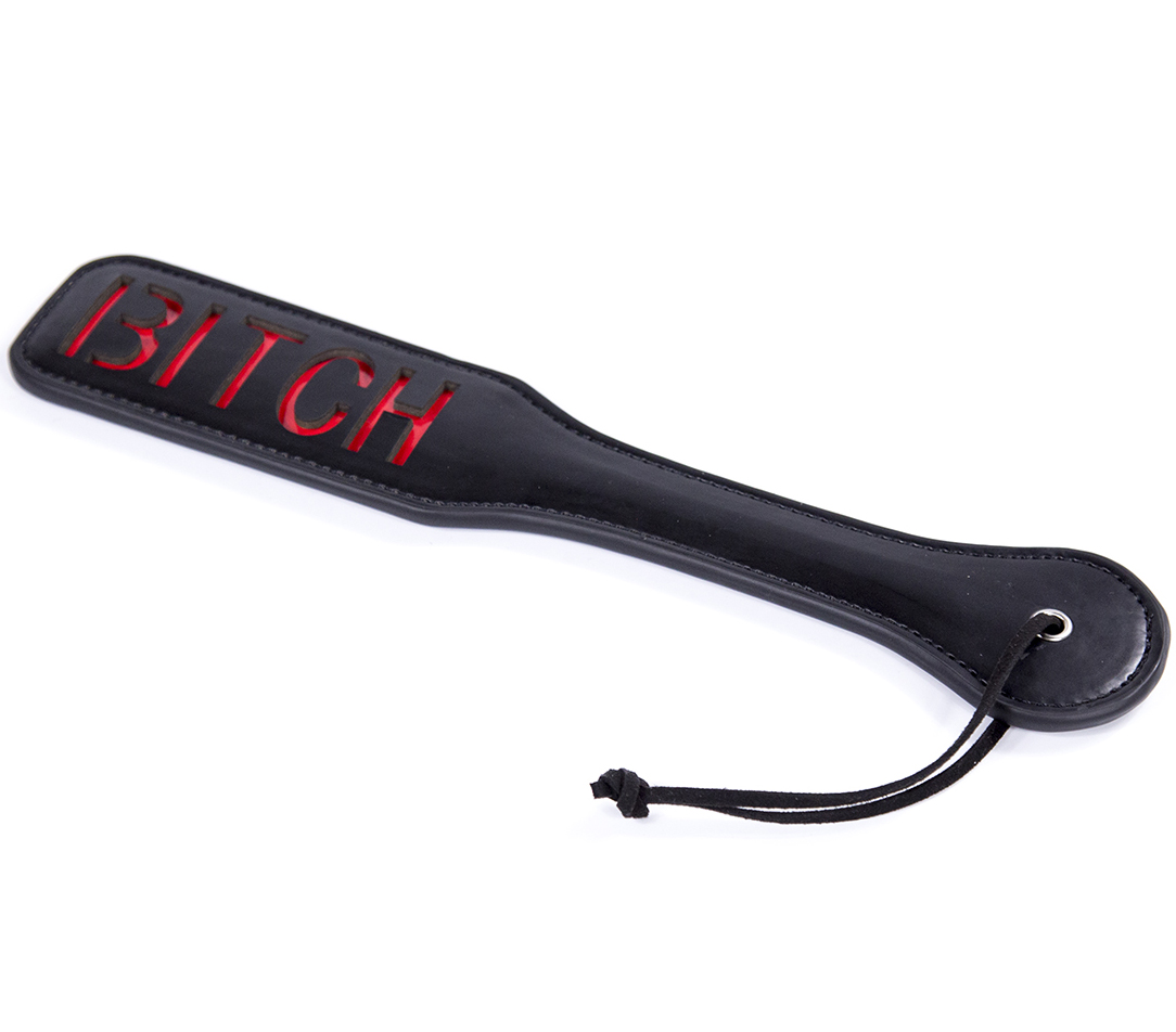 High quality Bondage play spanking leather paddle with "bitch" word by Naughty TOYS. Medium size 32 cm x 6 cm, for BITCHES, slaves and masters. Black faux leather slapper spanking paddle with red ‘Bitch’ cut out design. It can be playful but when you really exersice force and the slave will feel it. With practice, each spank leaves the word 'BITCH' on your sub's butt. Slightly flexible for maximum impact and contact with the skin. Wrist loop for confident swings and easy storage.