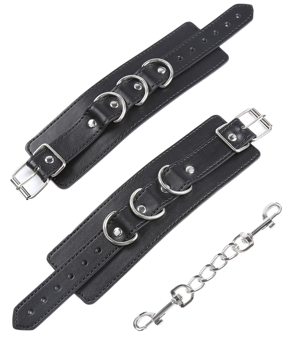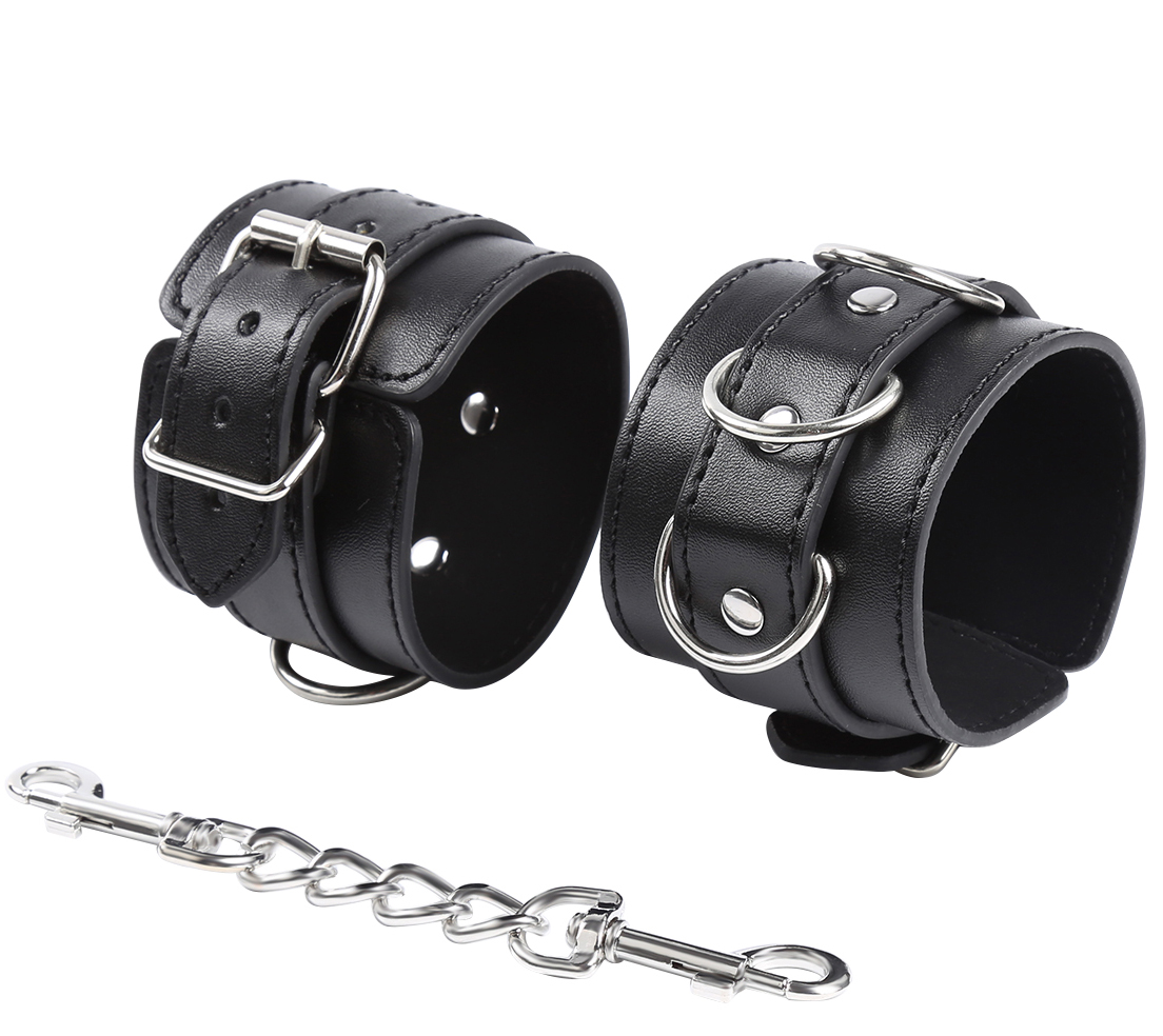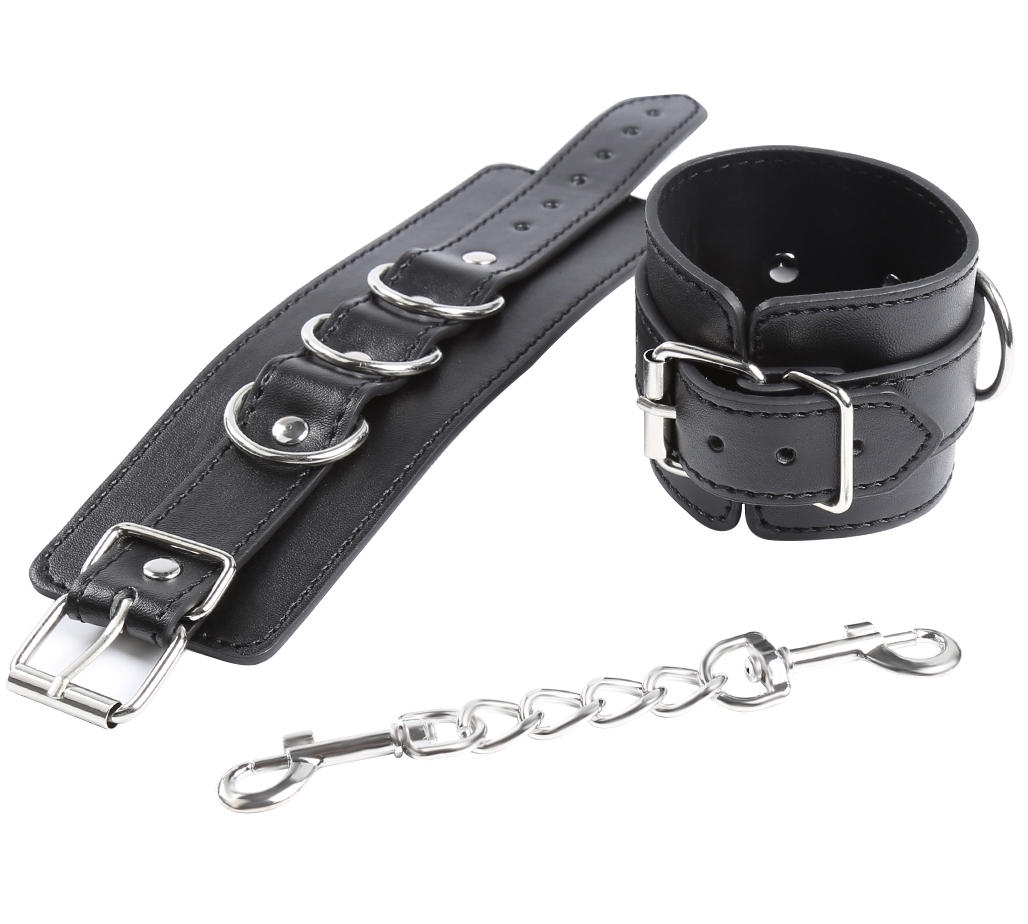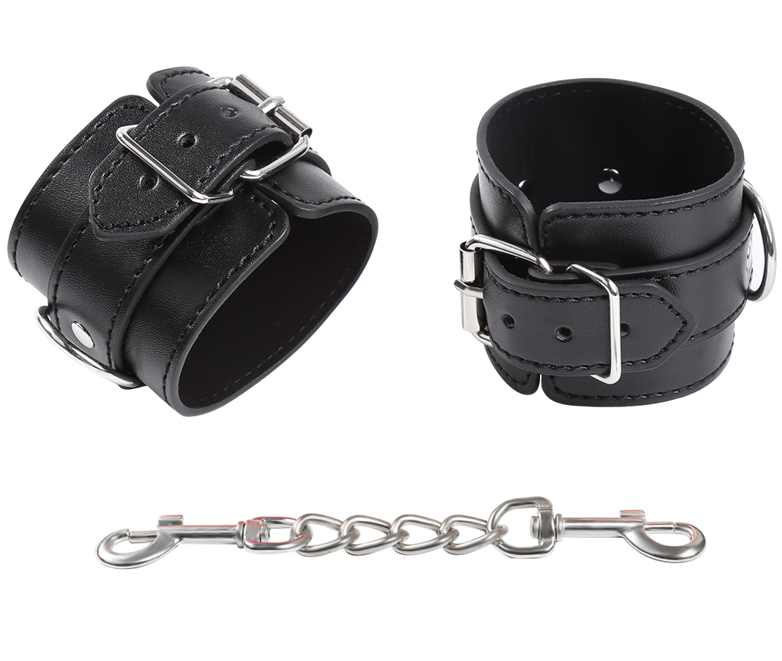 Black buckling leather wrist cuffs with 3-D-RING, made of high quality faux leather. An exquisite pair of leather wrist cuffs by NAUGHTY TOYS. ONE SIZE fully adjustable buckle straps. Unisex and fully adjustable buckle straps. It adjusts exactly to the point and as tight, you want it to be. Comes with a detachable double trigger hook chain connecting to a D-Ring.