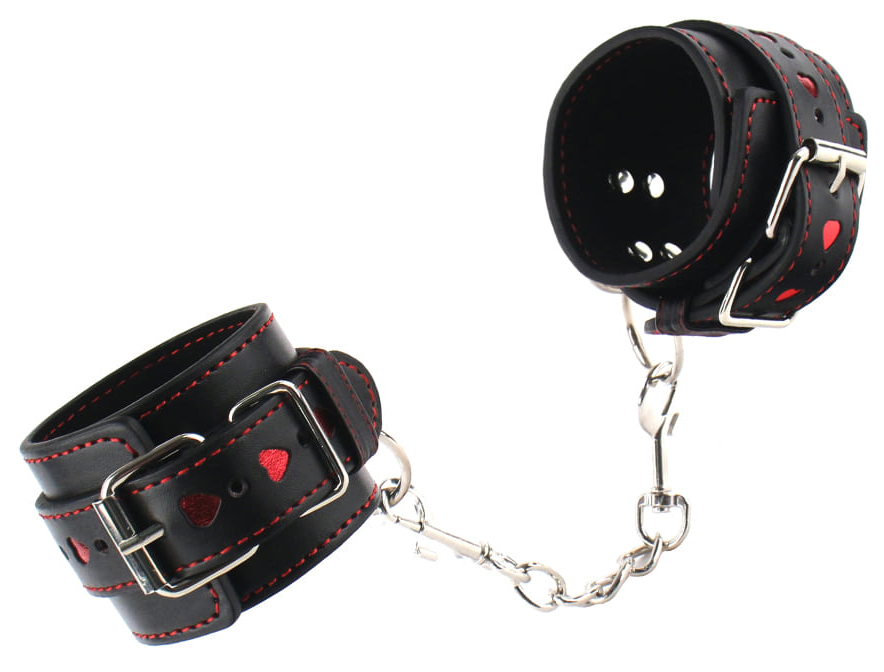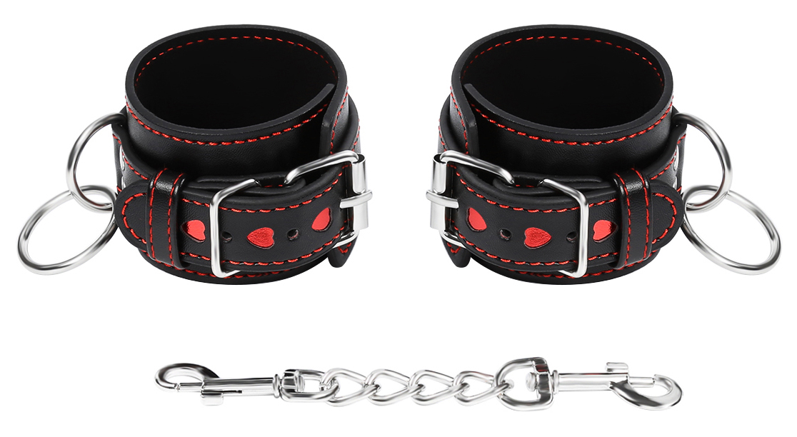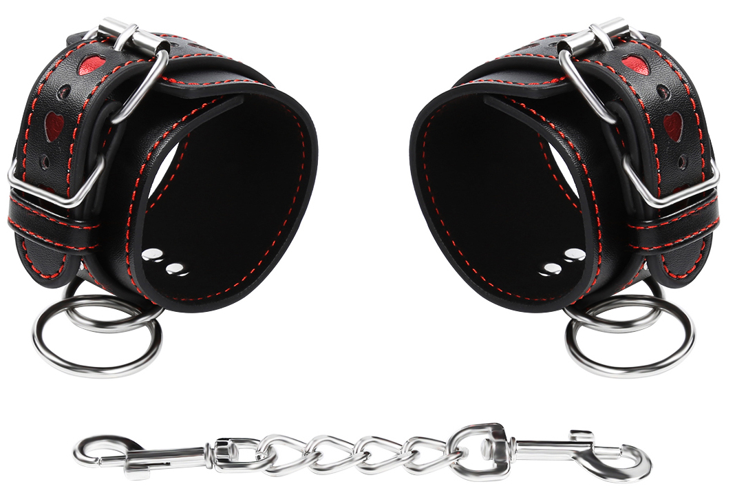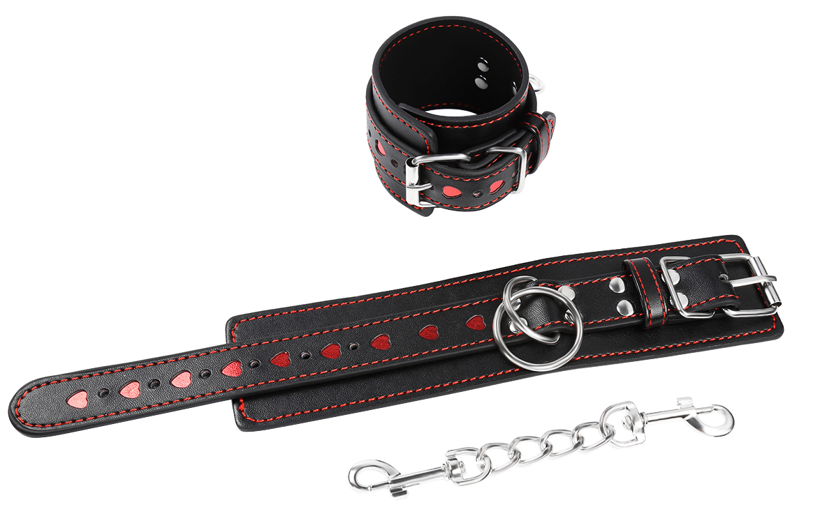Leather pu. With hearts. Unisex. One size and adjustable. Chain is detouchable. Amazing wrist cuffs to restraint the slave